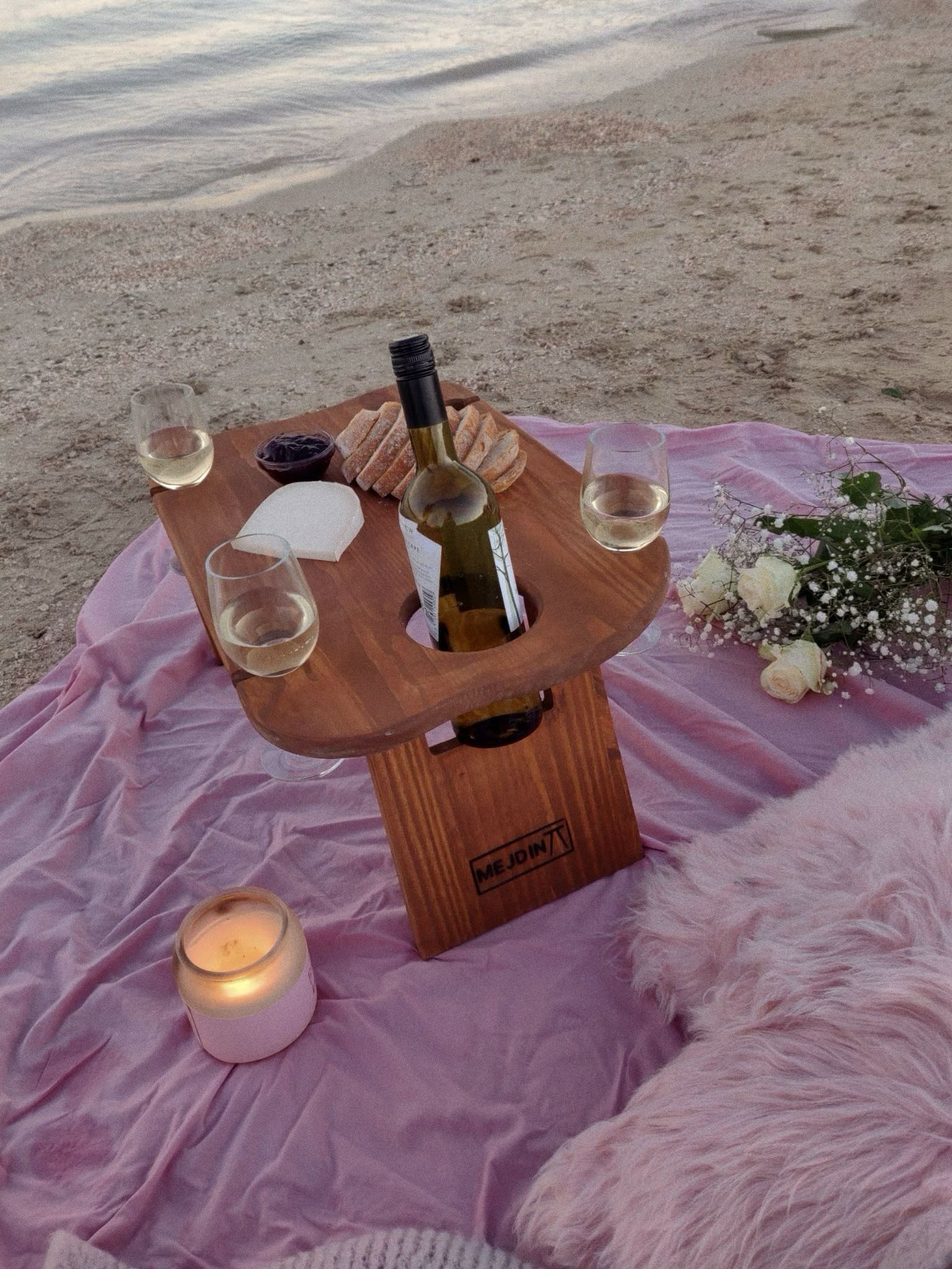 Functional by design, Mejdina includes integrated cut-outs for a wine bottle and two glasses, so you can enjoy your drinks without spills or tipping. Its lightweight frame makes it easy to carry, set up, and store, while the smooth, food-safe finish ensures it's safe for direct food contact and simple to clean.